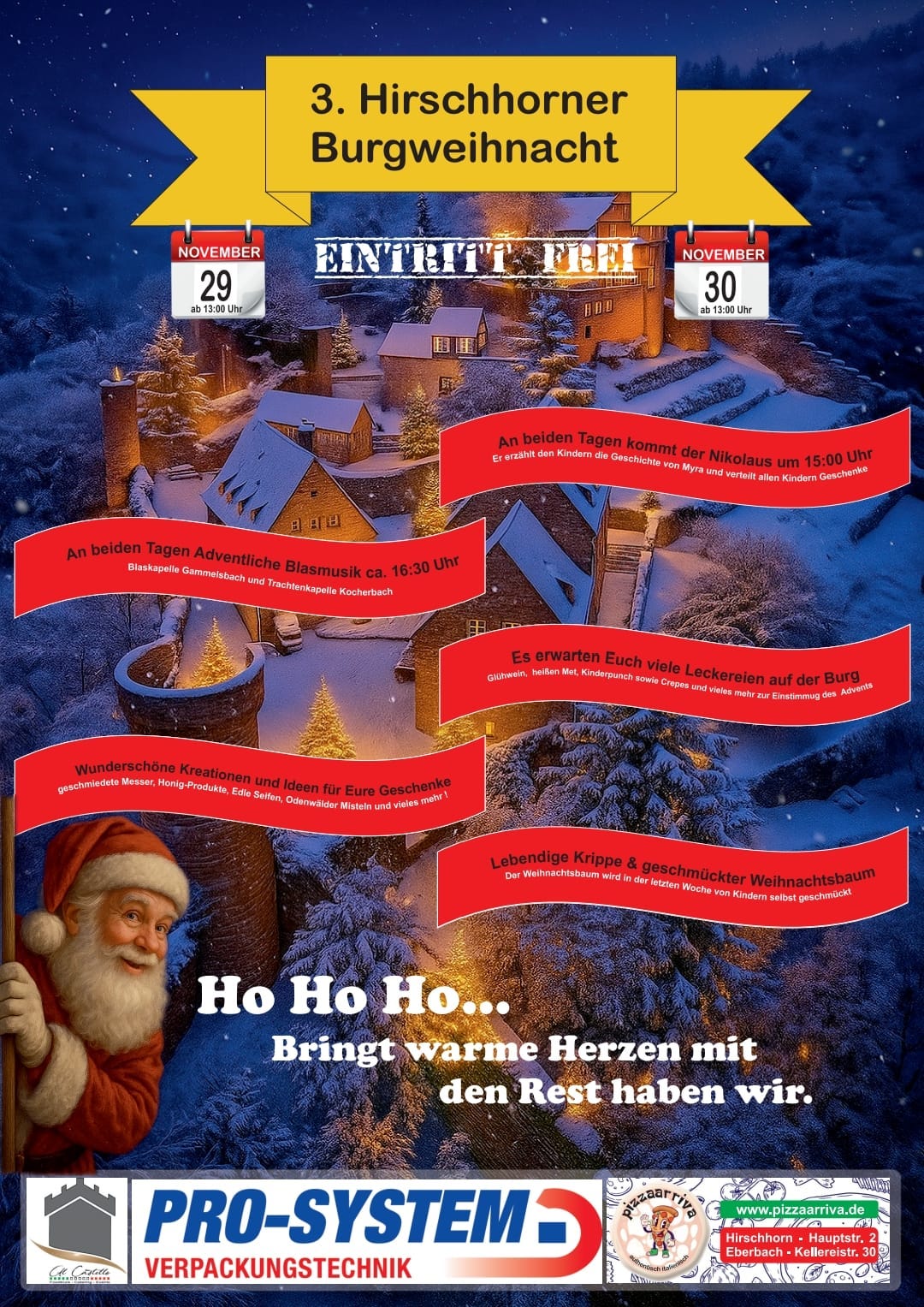 An beiden Tagen werden gegen 15 Uhr die Kinder vom Nikolaus seine Geschichte aus Myra erfahren und alle bekommen Geschenke, und gegen 16 Uhr werden Weihnachtliche Lieder im Burghof erschallen.