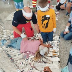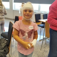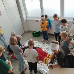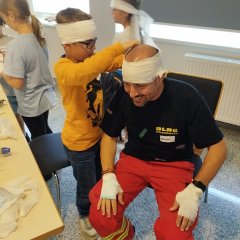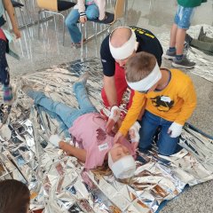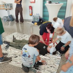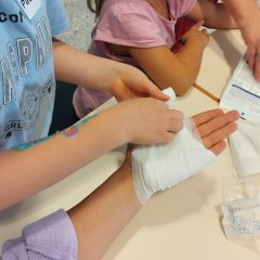 Nach einer kleinen Pause ging es weiter mit dem Thema Verletzungen. Hier durften die Kinder selbst Hand anlegen: Pflaster wurden gekonnt angebracht, "Wunden" fachgerecht versorgt und Verbände angelegt. Besonders spannend war für viele das Üben der stabilen Seitenlage, mit der bewusstlose Personen sicher gelagert werden.