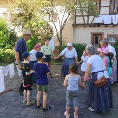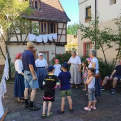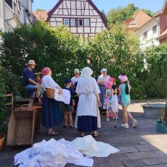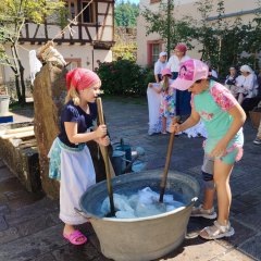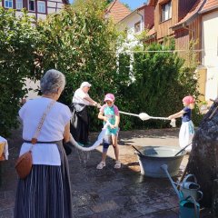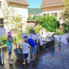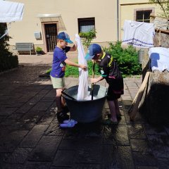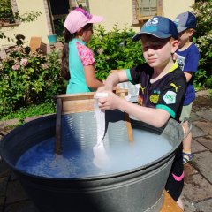 Mit großem Eifer machten sich die Kinder ans Werk: Ausgestattet mit Waschbrettern, Stampfern, Zinkwannen und duftender Kernseife lernten sie spielerisch, wie früher gewaschen wurde. Unterstützt wurden sie dabei liebevoll von Mitgliedern des katholischen Frauentreffs, die sich über die begeisterten kleinen Helferinnen und Helfer sehr freuten. Der Platz war bis zum Ende des Nachmittags dicht bespannt mit Wäscheleinen, an denen fröhlich flatternde, frisch gewaschene Wäschestücke zum Trocknen hingen – ein schöner Anblick und ein echtes Gemeinschaftserlebnis.