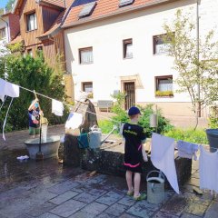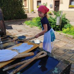Im Rahmen des diesjährigen Ferienspielprogramms der Stadt wurde ein ganz besonderes Erlebnis für Kinder angeboten: „Wäschewaschen wie zu Omas Zeiten“. Bei sommerlichen Temperaturen verwandelte sich der Platz am Hermannsbrunnen in eine historische Waschküche – ganz ohne Waschmaschine.