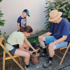 Doch nicht nur Wäsche wurde gewaschen: Auch alte Handwerkstechniken standen auf dem Programm. Unter Anleitung von Paul Keßler durften die Kinder selbst Rechenzacken aus Holz schlagen – ganz wie es früher gemacht wurde. Mit viel Geschick, Konzentration und Spaß wurde gehämmert. Viele Kinder hielten am Ende stolz ihr selbst gefertigtes Werkstück in den Händen – ein echtes Stück Handarbeit mit Geschichte.