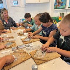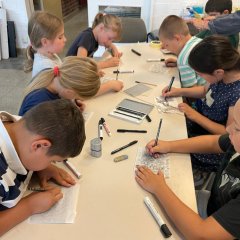 Nach einer kurzen theoretischen Einführung durften die jungen Teilnehmerinnen und Teilnehmer direkt selbst Hand anlegen. Mit sichtbarem Eifer schnitzten sie zunächst ihre Initialen in sogenannte Softcut-Druckplatten – ein weiches Material, das besonders gut für erste Druckversuche geeignet ist. Danach war der Kreativität keine Grenze mehr gesetzt: Muster, Fantasiewesen und sogar kleine Szenen fanden ihren Weg auf die Druckplatten und wurden in bunten Farben zu Papier gebracht.